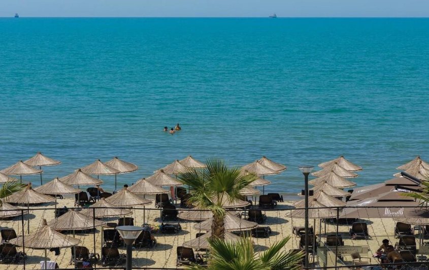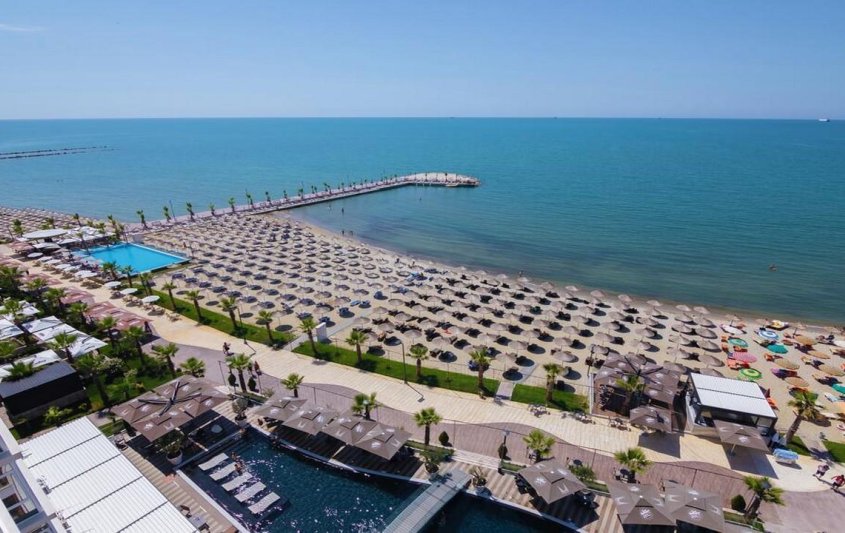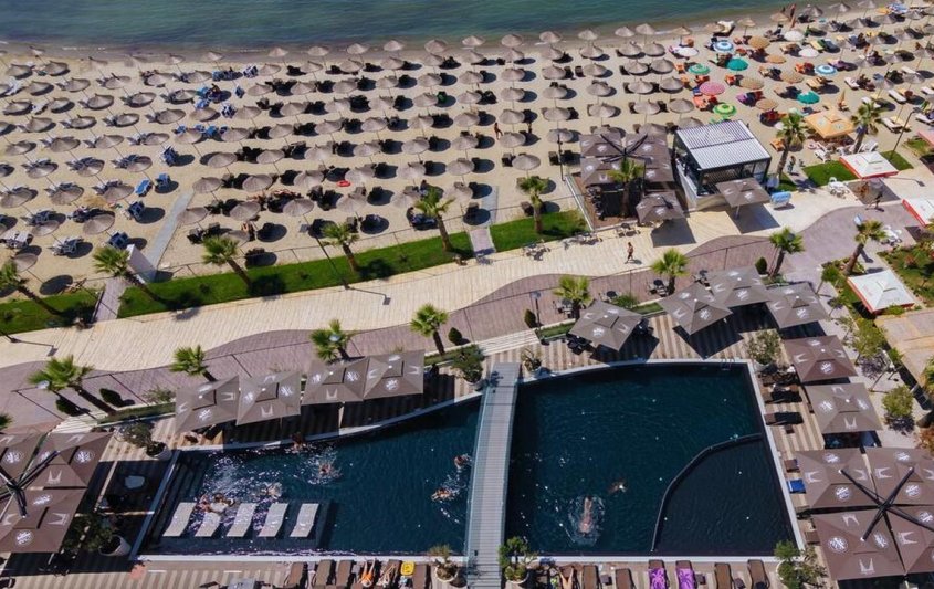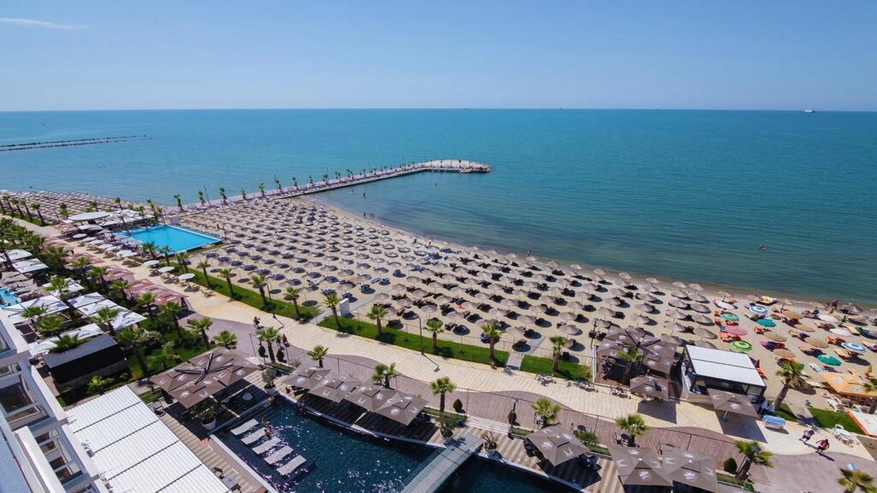 - Частен пясъчен плаж с шезлонги и чадъри