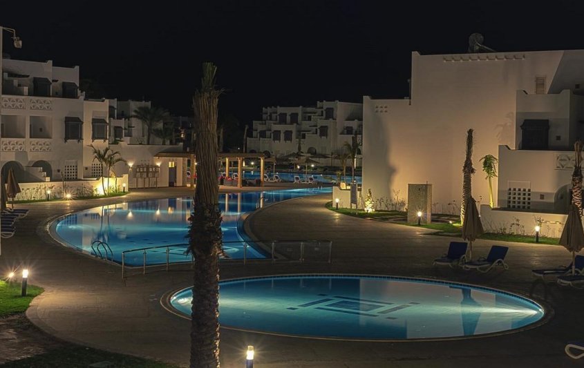 Намира се на 8 км. от летище Хургада, на 12 км. от центъра на Хургада, на брега на морето.