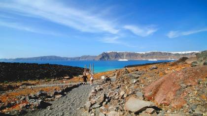 През 1600 пр.н.е. вулканът изригнал с такава мощ, че централната част на Санторини полетяла във въздуха. На нейно място се образувал огромен кратер, наречен калдера, който се запълнил с морска вода. Днес на малкия остров Неа Камени, който се намира в калдерата, има активен вулкански кратер. При тази екскурзия ще посетите кратера на вулкана и горещите извори, които се намират в близост до него. За тази екскурзия е препоръчително да имате удобни обувки, слънчеви очила и шапка.